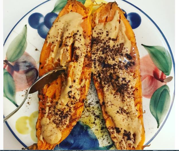 - Dinner: I love huge greens salads with quinoa and sweet potatoes. Just like my smoothie, I load my salads. If I’m fixing for something warmer, I’ll do grilled veggies or a stir fry of sorts. I’m a firm believer in trying to get veggies in with each meal. I try to keep it varied and get what’s in season.